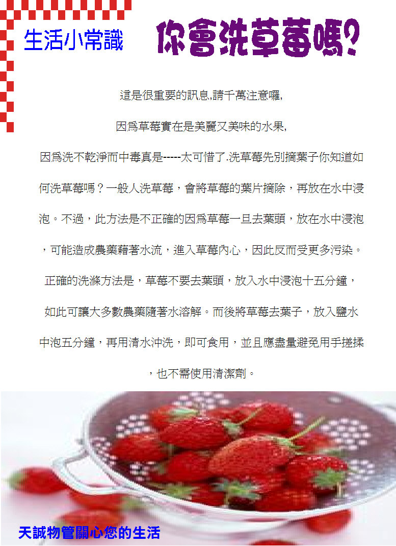 這是很重要的訊息,請千萬注意囉, 因為草莓實在是美麗又美味的水果, 因為洗不乾淨而中毒真是-----太可惜了.洗草莓先別摘葉子你知道如何洗草莓嗎?一般人洗草莓,會將草莓的葉片摘除,再放在水中浸泡。不過,此方法是不正確的因為草莓一旦去葉頭,放在水中浸泡,可能造成農藥藉著水流,進入草莓內心,因此反而受更多污染。正確的洗滌方法是,草莓不要去葉頭,放入水中浸泡十五分鐘,如此可讓大多數農藥隨著水溶解。而後將草莓去葉子,放入鹽水中泡五分鐘,再用清水沖洗,即可食用,並且應盡量避免用手搓揉,也不需使用清潔劑。